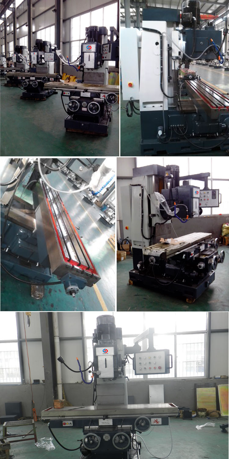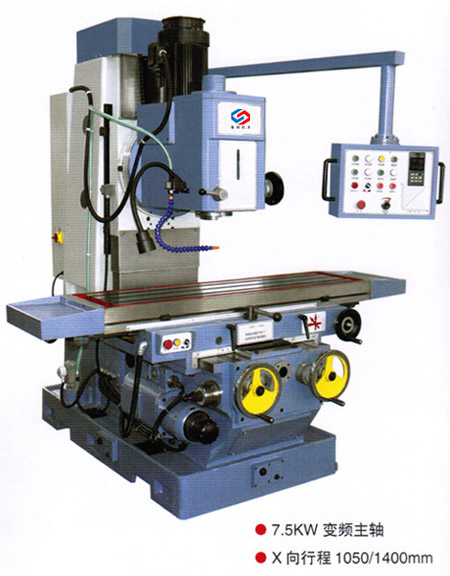 X7150床身銑床 X7150床身銑床是我公司根據普通銑床受行程限制,穩定性不好,動力不足等問題而自行設計研發的超大行程(1400*500),超大動力(主電機11kw),自重大(淨重4900KG),載重大(一體加強鑄鐵床身),穩定性好(高頻淬火矩形導軌)的床身式銑床! 1、底座、機身、工作台、中滑座等主要構件均採用高強度材料鑄造而成,並經人工時效處理,保證機床長期使用的穩定性。2、整體結構爲床身式結構,銑頭爲大功率機械調速高精度銑頭,銑頭可在左、右20°範圍内工作;主軸套筒的進給具有自動、手動、手動微調等功能;主軸剛性大,調速方便、靈活。 3、主軸箱可手動、機動上下升降完成機動進給和快速移動,操作方便、快捷。 4、床身上縱、橫向有手動進給、機動進給和機動快進三種,不同的進給速度,能滿足不同的加工要求;快速進給可使工件迅速到達加工位置,縮短非加工時間。 5、工作台X向行程可達1400mm,拓展瞭機床加工範圍, Y、Z向導軌爲寬矩形導軌,且X、Y、Z三方向導軌副經超音頻淬火、精密磨削及刮研處理,配合強制潤滑,減小低速爬行,提高精度,延長機床的使用壽命。 6、潤滑裝置可對縱、橫、垂向的絲杠及導軌進行強制潤滑,減小機床的磨損,保證機床的高效運轉;同時,冷卻系統通過調整噴嘴改變冷卻液流量的大小,滿足不同的加工需求。 7、機床操作系統通過支臂懸挂在機床的右上方,符合人體工程學原理,操作方便;操作面闆均使用形象化符号設計,簡單直觀。 ![]() ![]()